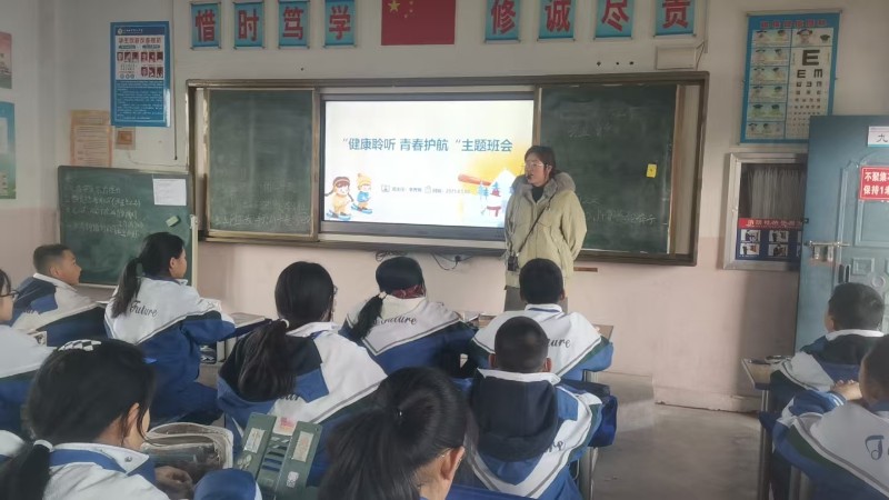 七年级以“健康聆听 青春护航”为主题开展班会。引导学生增强听力健康意识、养成科学用耳行为,保护听力健康。